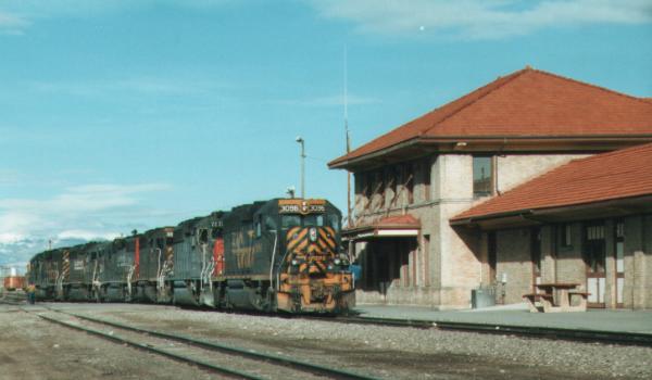 Alamosa is the main city in the San Luis Valley, Colorado. The Rio Grande trains used to arrive from Pueblo to East Yard, just outside the city. On the way from Pueblo was Walsenburg and La Veta Pass. At East Yard the train wss split up into two locals. One served the branch to South Fork and the other went south to Antonito. Until the middle of the 1960s most of the tracks in the town and the branch to Antonito were dual gauge.