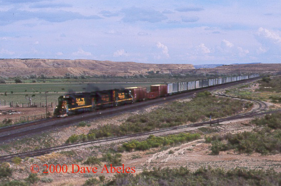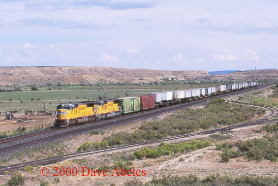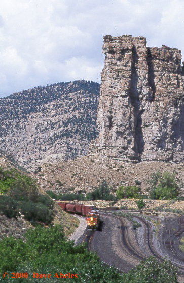 It wasn’t long before I came upon the U.S. 6 interchange, and thus a turn to the east for the climb over Soldier Summit. The flatlands quickly gave way to stiff grades, and I realized that the railroad was beside the highway as moonlight would occasionally catch the shiny tops of the rails. I passed a several trains in the darkness too, westbound on the western side of the slope, and therefore under full dynamic braking for the trip down to Salt Lake. Eventually I passed Soldier Summit, and began the descent to Helper, UT, and the reason for my trip: the last bastion of Denver and Rio Grande Western locomotives on the old Rio Grande mainline. The road passes right through Helper at the eastern base of the Wasatch Mountains, and as I neared the town, I decided that I had to stop out of pure principle. Things were dark and quiet upon my arrival, and across the yard through some cars I could hear power, but couldn't see anything. Off to bed I went.