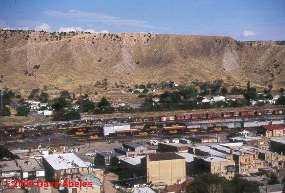 The alarm went off at 6:30 a.m. (I learned to really appreciate the 2 hrs gained flying out there from the East Coast) and I headed for Helper. The Book Cliffs and the Wasatch Mountains form an impressive backdrop. As I pulled in, there were 3 of the anticipated Rio Grande SD40T-2's in the engine facility. About a half-hour later, 7 more pulled into the yard from the west, having drifted back into town after being cut out of the middle of a UP coal drag headed for export.
