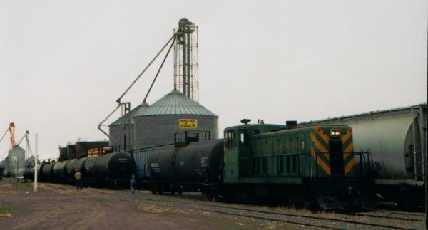 Tank cars with liquid fertilizer were being unloaded at Center. We also watched SLC 5033 being filled with grain . SLC has a sizable fleet of freight cars, a total of 833 cars according to the January 1999 issue of ORER. I find it especially interesting to watch their mechanical reefers and see the previous owners logos barely covered with almost matching paint. Their covered hopper fleet consists of both Canadian style cylindrical cars and rib side covered hoppers, mostly Trinity built 4750 cuft cars. Roland spent a lot of time checking and correcting his drawings of the tracks and adjacent buildings. This will probably be the most interesting part of his model railroad.